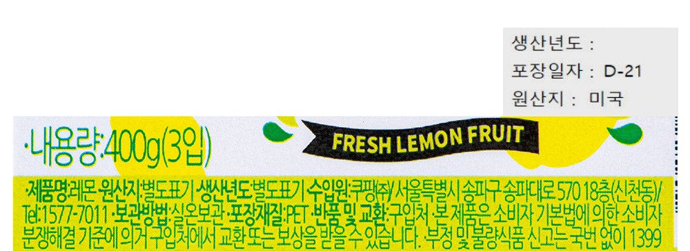 | 제조연월일, 소비기한 또는 품질유지기한 | 업데이트 예정 | 세부 품목군별 표시사항 | 농수산물 : 유전자변형(해당 없음) / 지리적 표시사항(해당 없음) |