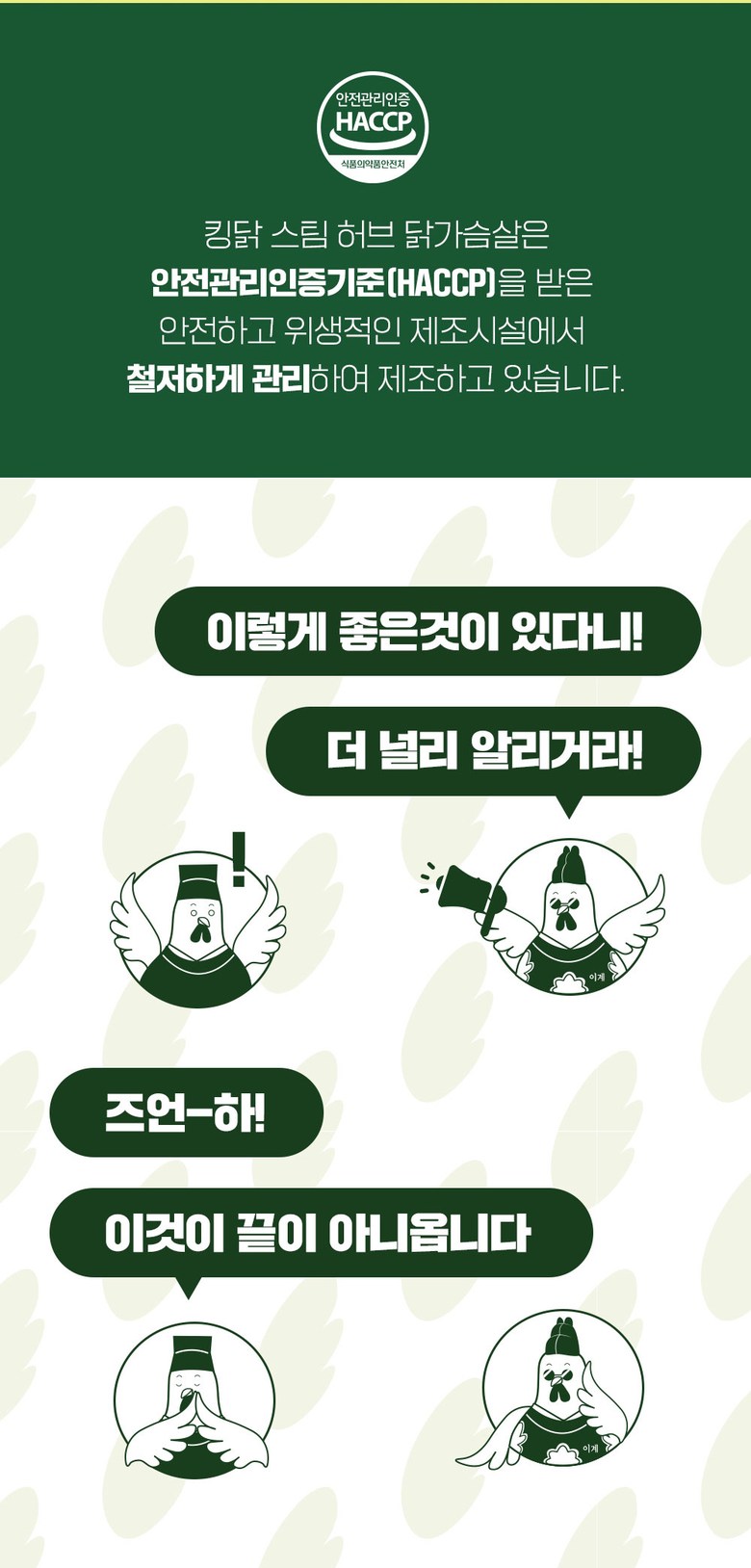 | 포장단위별 내용물의 용량(중량), 수량 | 100g, 50팩 | 원재료명 및 함량 | 닭가슴살(국내산) 96.2%, 복합조미식품[정제소금(중국산), 알파콘(옥수수100%/외국산:호주,브라질,우크라이나 등)] |