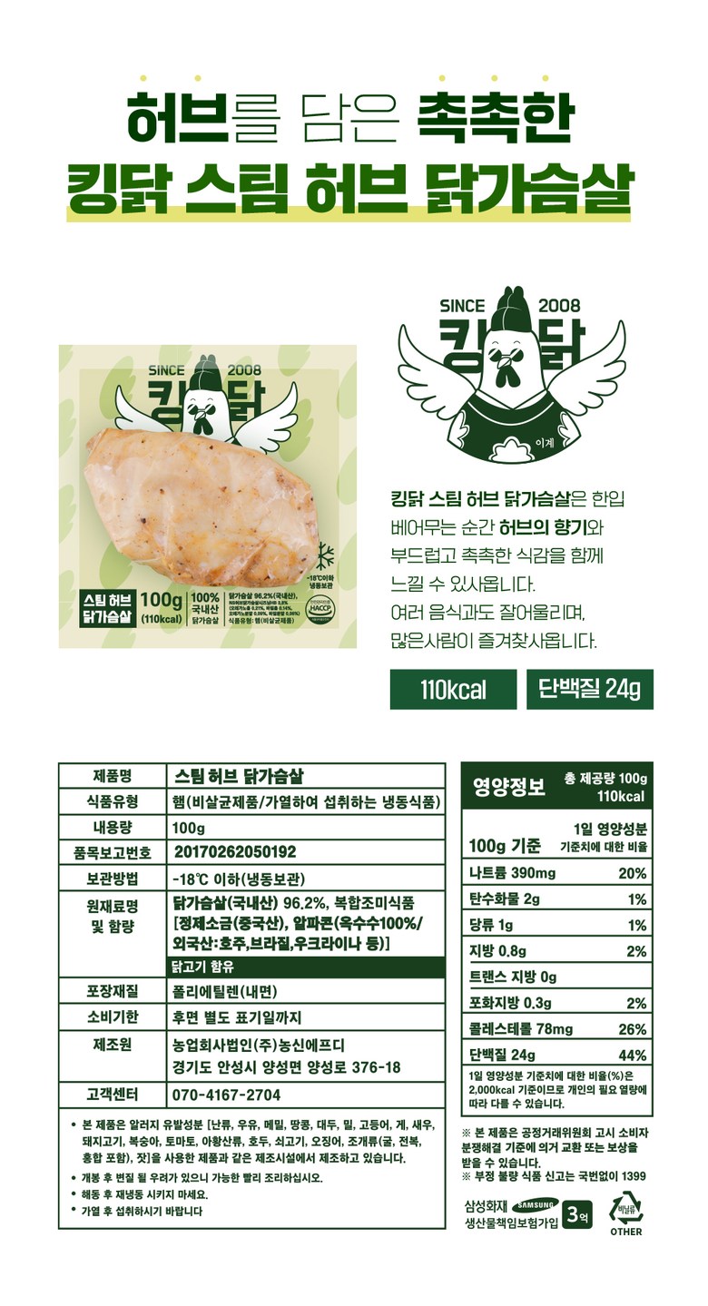 | 제품명 | 스팀허브 닭가슴살 | 식품의 유형 | 햄(비살균제품/가열하여 섭취하는 냉동식품) |