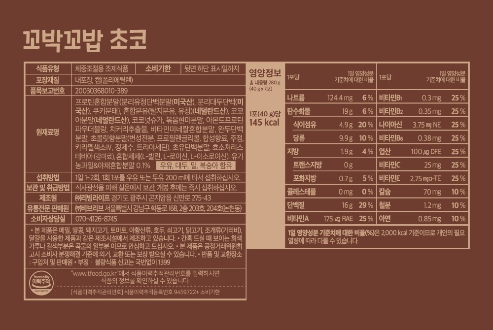 | 제품명 | 꼬박꼬밥 초코 | 식품의 유형 | 컨텐츠 참조 |