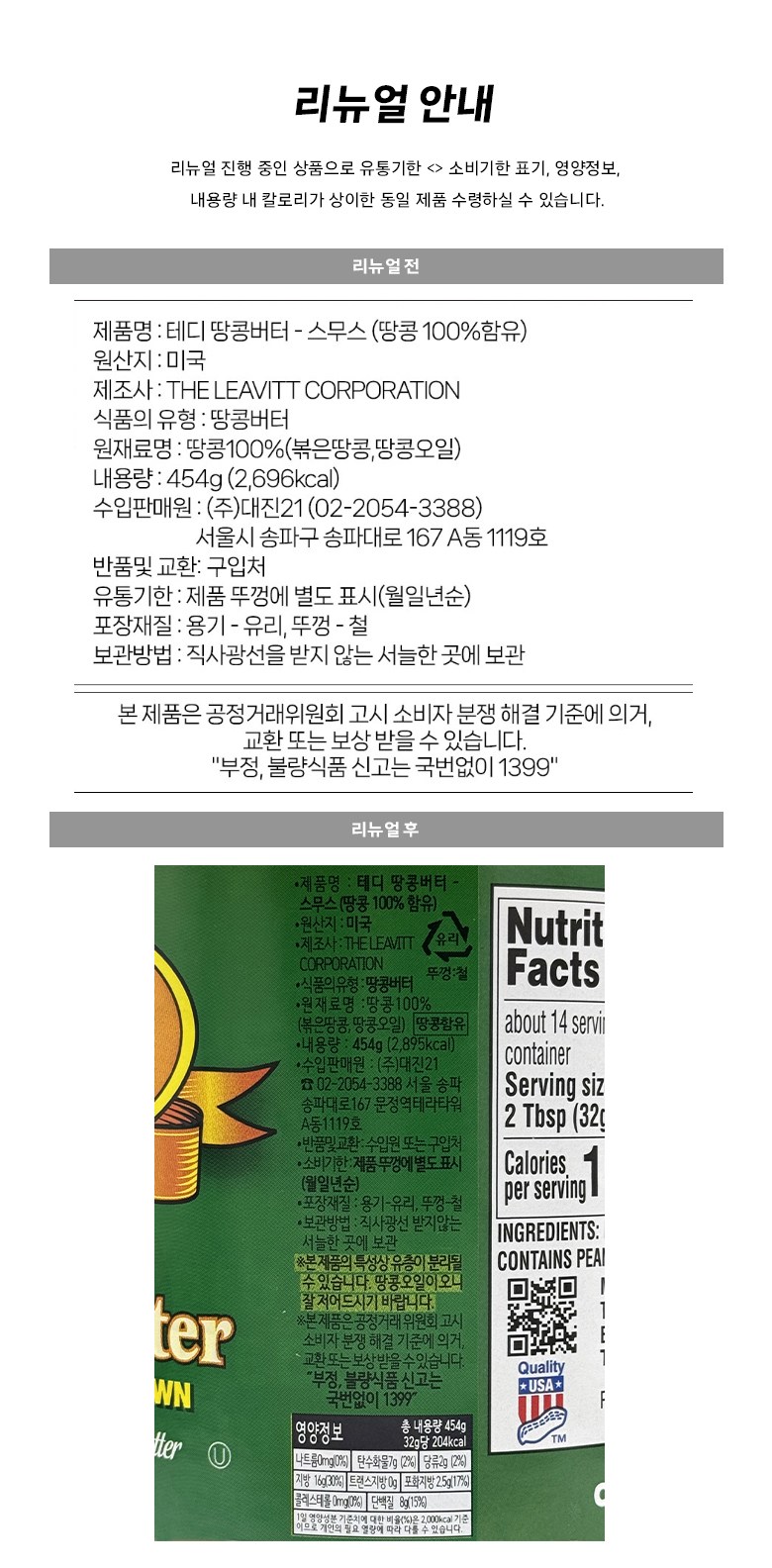 | 제품명 | 테디 땅콩버터-스무스(땅콩 100% 함유)(454g) | 식품의 유형 | 컨텐츠 참조 |