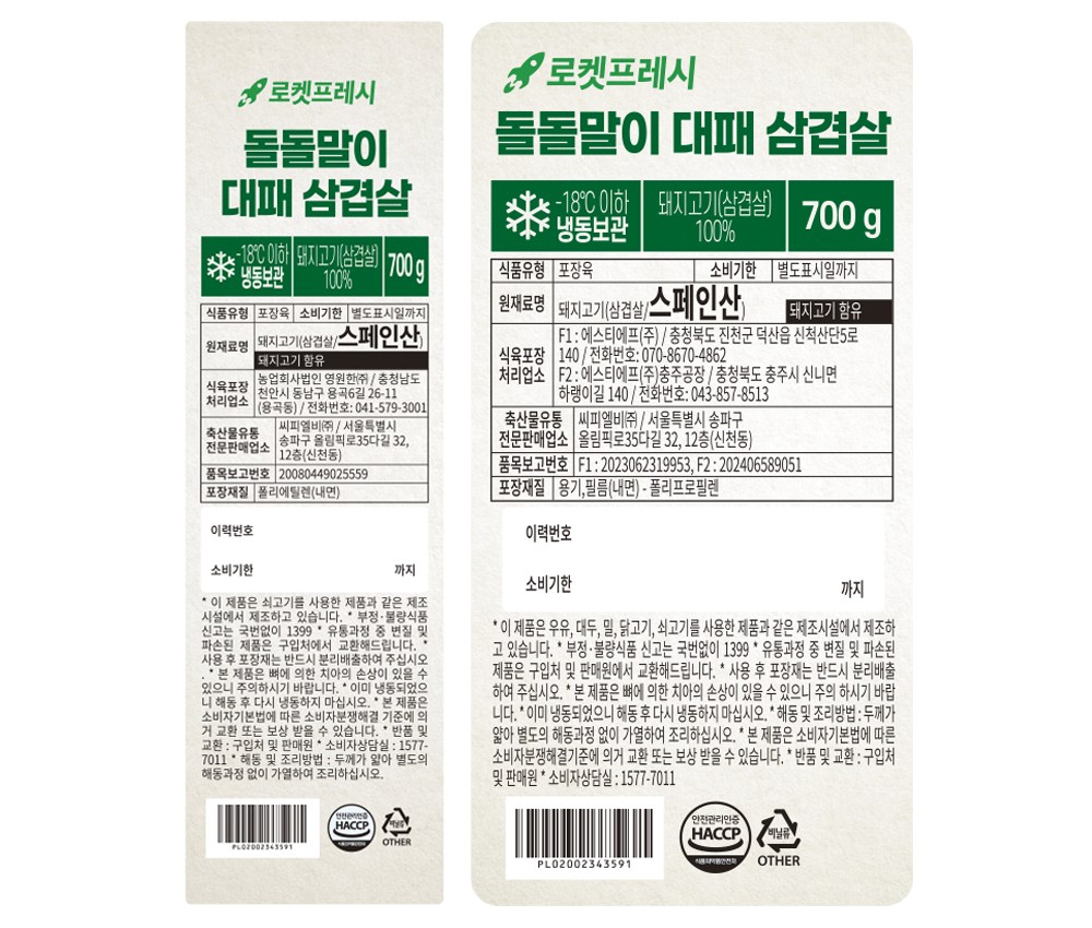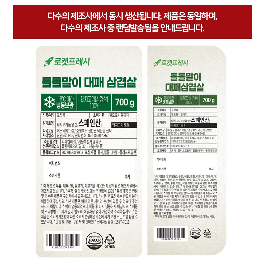 | 품목 또는 명칭 | 돌돌말이 대패삼겹살 | 포장단위별 내용물의 용량(중량),수량,크기 | 700g x 4개,1개 |