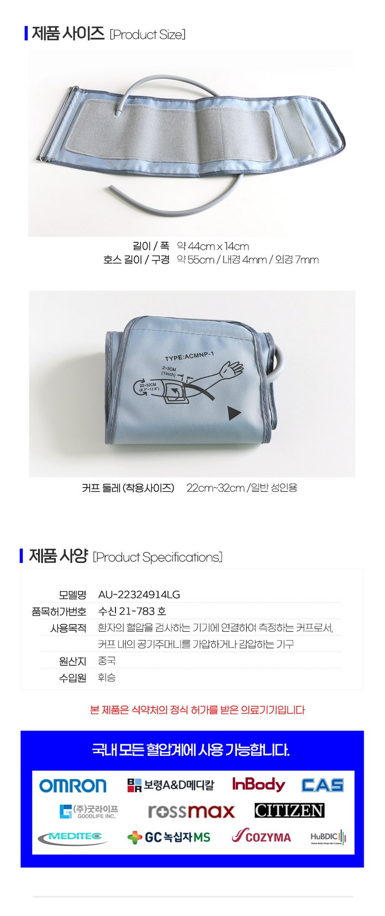 | 품명 및 모델명 | 혈압계 커프 | 인증/허가 사항 | 의료기기 |