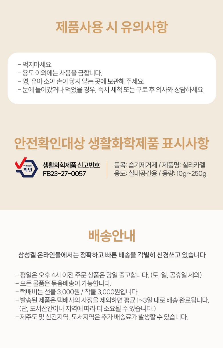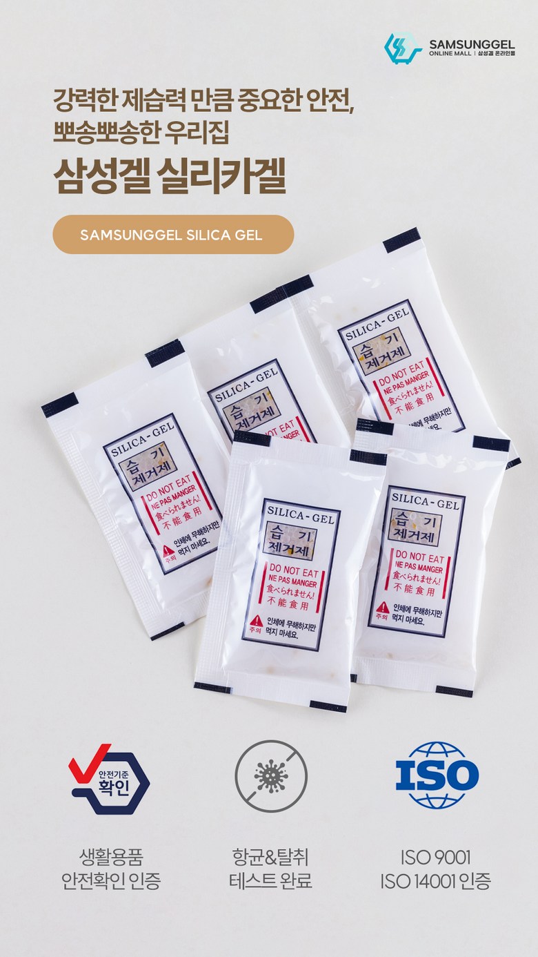 | 효과,효능 (승인대상 제품에 한함) | 습기제거제 | 수입자(수입제품에 한함), 제조국 및 제조사 | 주식회사 삼성겔 / 대한민국 |