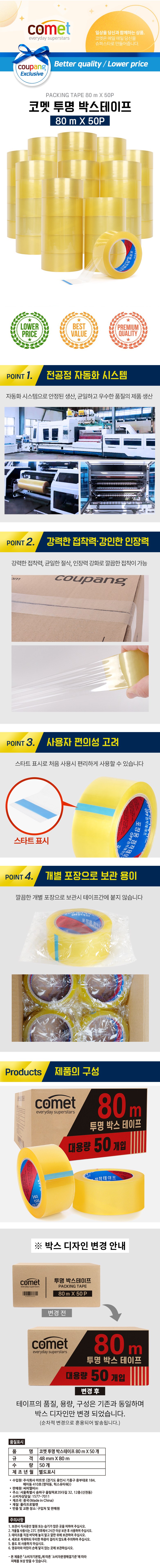 | 품명 및 모델명 | 코멧 경포장 투명 박스 테이프 80 m 50p | 인증/허가 사항 | 해당없음 |
