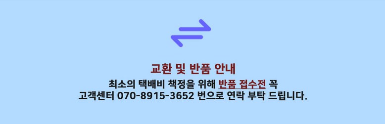 | 교환/반품 신청 기준일 | ㆍ단순변심에 의한 교환/반품은 제품 수령 후 7일 이내까지, 교환/반품 제한사항에 해당하지 않는 경우에만 가능 (배송비용과 교환/반품 비용 왕복배송비 고객부담) ㆍ상품의 내용이 표시·광고의 내용과 다른 경우에는 상품을 수령한 날부터 3개월 이내, 그 사실을 안 날 또는 알 수 있었던 날부터 |