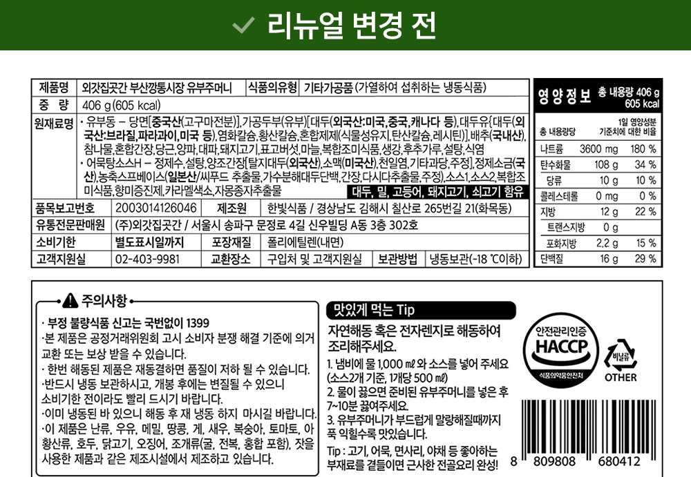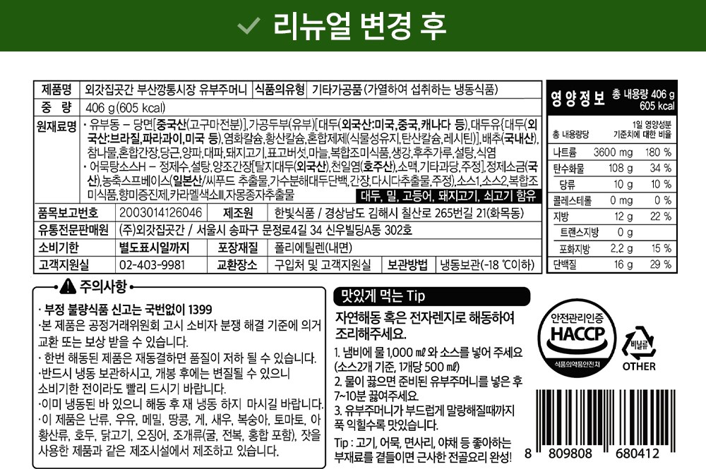 | 포장단위별 내용물의 용량(중량), 수량 | 406g x 1개 | 원재료명 및 함량 | 컨텐츠 참조 |