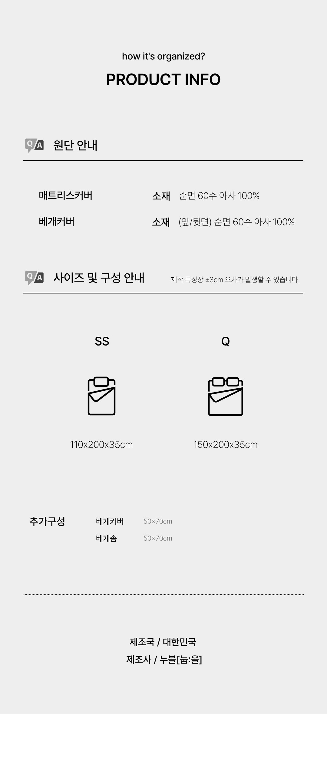 | 치수 | 컨텐츠 참조 | 제품구성 | 매트리스커버 단품 |