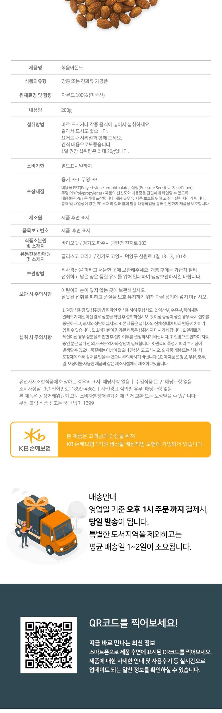 | 포장단위별 내용물의 용량(중량), 수량 | 200g x 5개 | 원재료명 및 함량 | 아몬드 100%(미국산) |