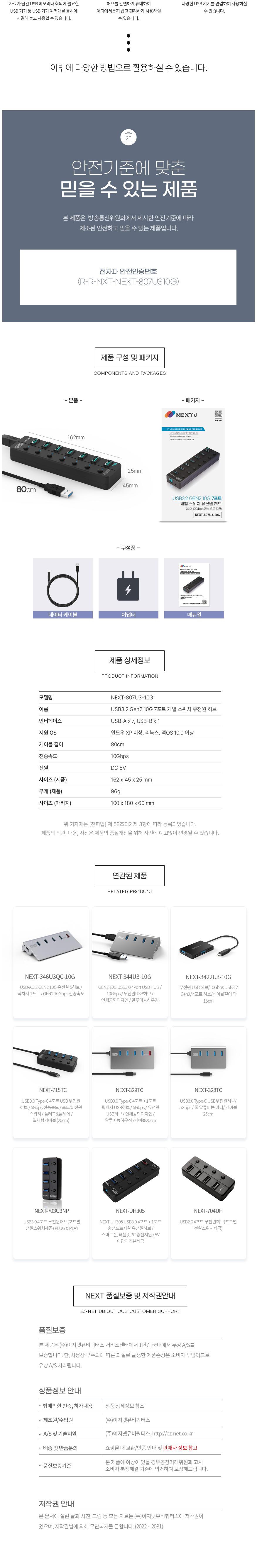 | 품명 및 모델명 | 넥스트유 유전원 7포트 USB3.2 10G 멀티허브 / NEXT-807U3-10G | KC 인증정보 | 뵨품:R-R-NXT-NEXT-807U310G / 어댑터:SU10592-14003B, R-R-XED-KC050200C |