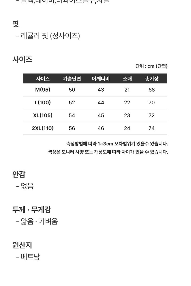 - 상의 사이즈: 남성 XXL (110)