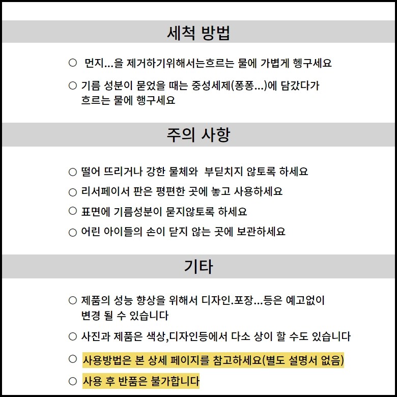 - ㆍ교환/반품에 관한 일반적인 사항은 판매자가 제시사항보다 관계법령이 우선합니다.