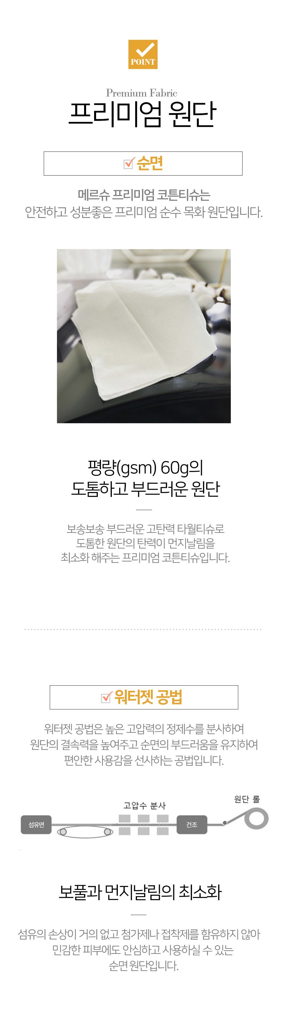 | 품명 및 모델명 | 메르슈 프리미엄 코튼티슈 | 인증/허가 사항 | 위생용품 |