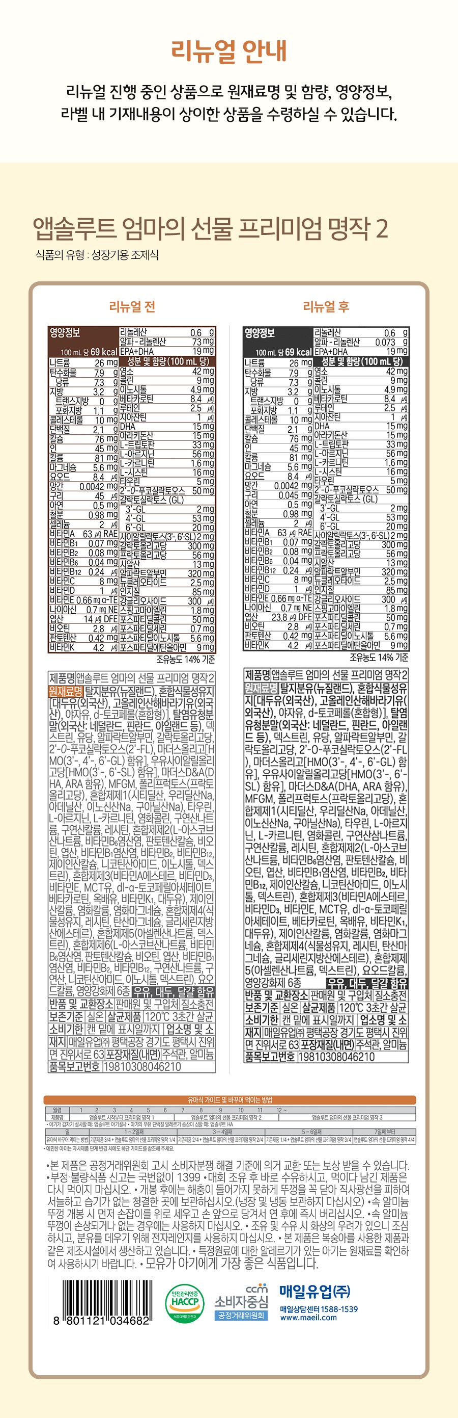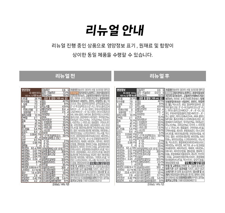 | 포장단위별 내용물의 용량(중량), 수량 | 800g, 6개 | 원재료명 및 함량 | 리뉴얼 전: 컨텐츠 참조 / 리뉴얼 후: 컨텐츠 참조 |