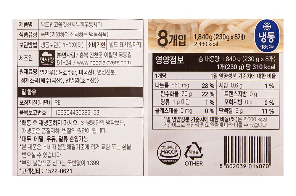 1993년부터 더욱 맛있는 면을 연구해온 브랜드, 면사랑이 선보이는 사누끼 우동사리를 만나보세요. 사누끼면 특유의 찰지고 쫄깃한 식감을 한껏 살려 만들었죠. 깔끔하고 담백한 풍미가 좋아 어떤 요리와도 궁합이 좋답니다. 달짝지근한 국물을 준비해 우동으로 즐겨도 맛있고, 맛깔난 양념과 함께 볶음 요리를 만들어도 좋아요.