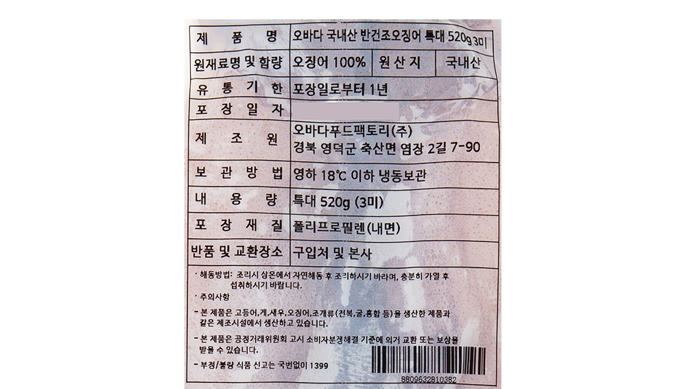 | 품목 또는 명칭 | 오바다 국내산 반건조오징어 특대 520g 3미 | 포장단위별 내용물의 용량(중량),수량,크기 | 520g x 2개,1개 |