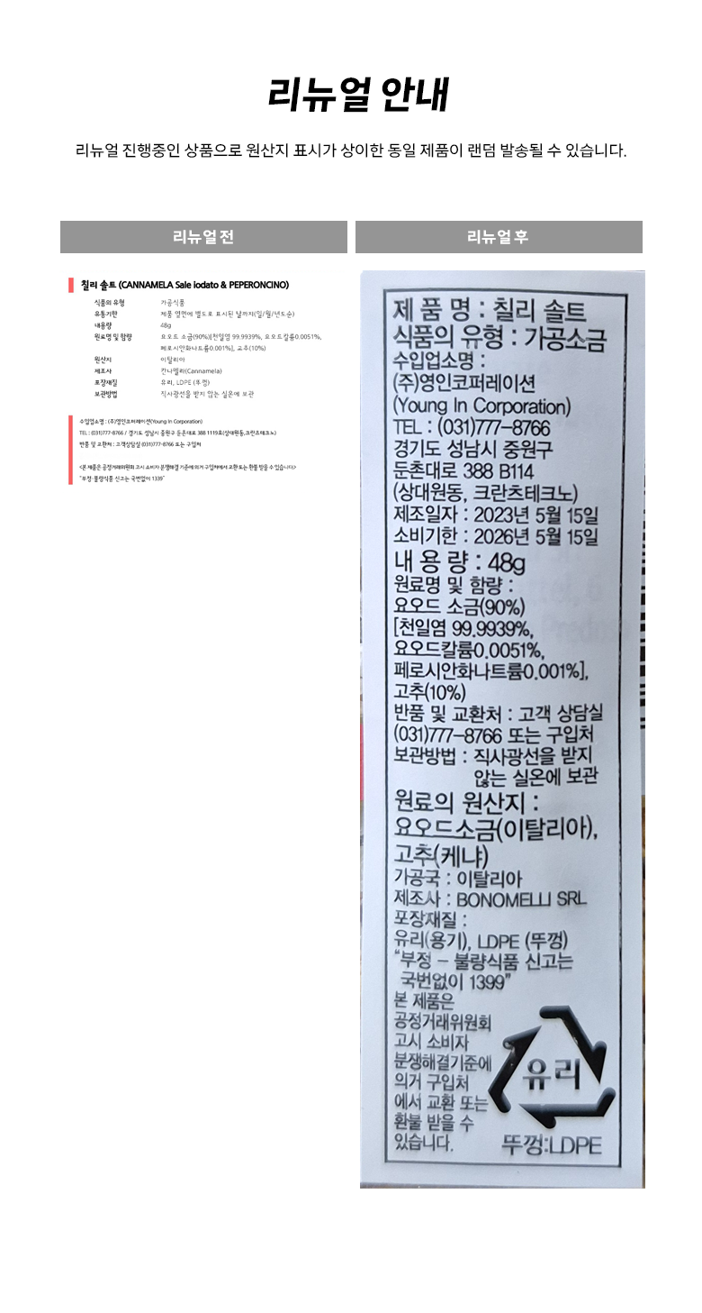 | 제품명 | 칸나멜라 칠리솔트 | 식품의 유형 | 컨텐츠참조 |