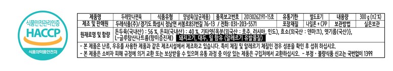 | 생산자 및 소재지 | 경기도 화성시 정남면 서봉로851번길 76-13 두레식품(주) | 제조연월일, 소비기한 또는 품질유지기한 | 제조일로부터 180일 입니다 :) |