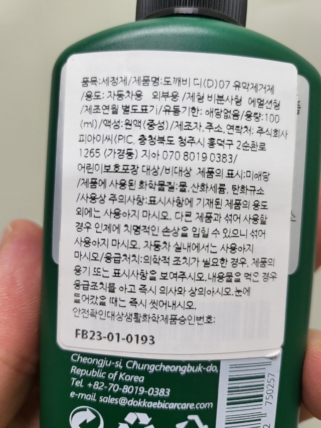 | 품목 및 제품명 | 세정제/ 도깨비 디(D)07 유막제거제 | 용도(표백제의 경우 계열을 함께표시) 및 제형 | 자동차용-외부용 / 비분사형-에멀션형 |