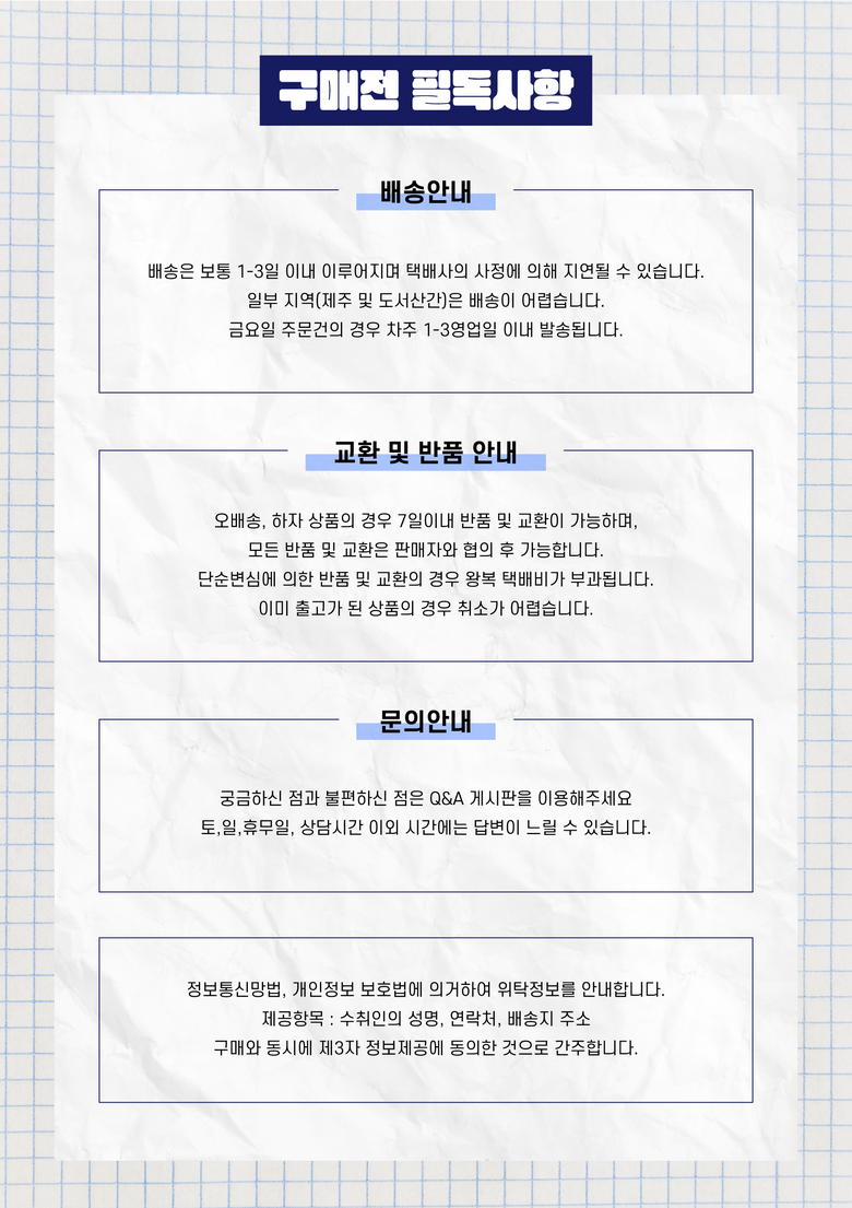 - ㆍ교환/반품에 관한 일반적인 사항은 판매자가 제시사항보다 관계법령이 우선합니다.