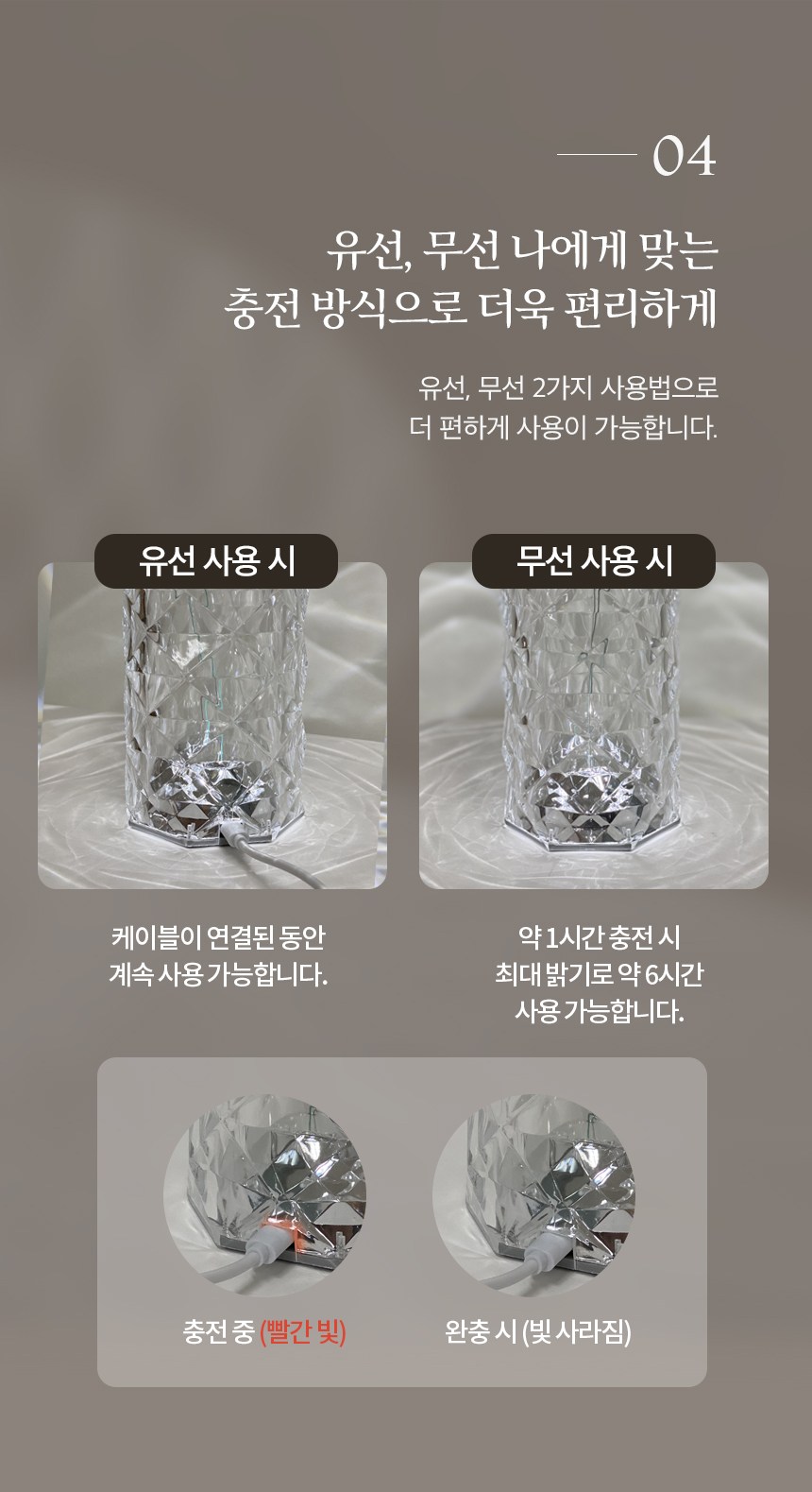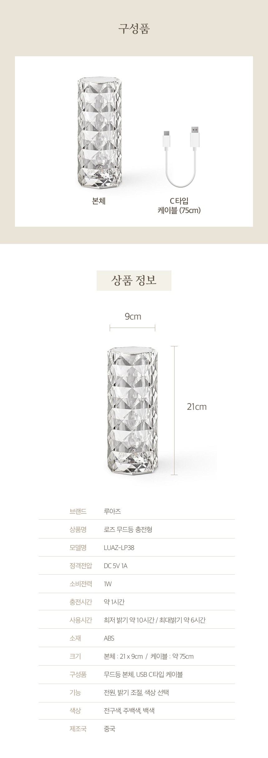 | 품명 및 모델명 | 루아즈 무선 충전형 LED 크리스탈 로즈 무드등 LUAZ-LP38 | KC 인증정보 | 해당없음 |