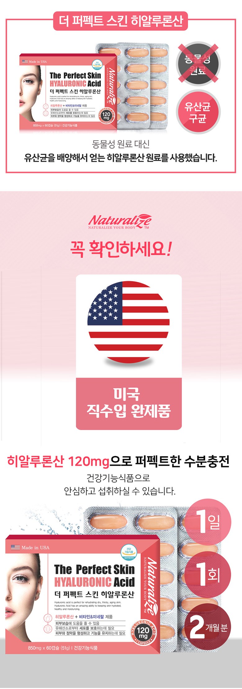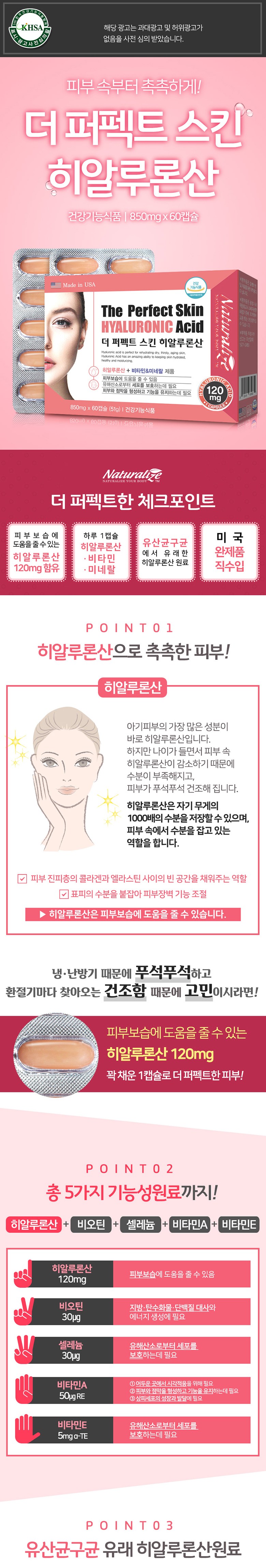 | 제품명 | 더 퍼펙트 스킨 히알루론산 | 제조업소의 명칭과 소재지 | Naturalize Health Inc. / 주식회사 승명 / 미국 |