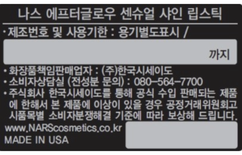 | 화장품제조업자, 화장품책임판매업자 및 맞춤형화장품판매업자 | NARS COSMETICS / (주)한국시세이도 | 제조국 | 미국 |