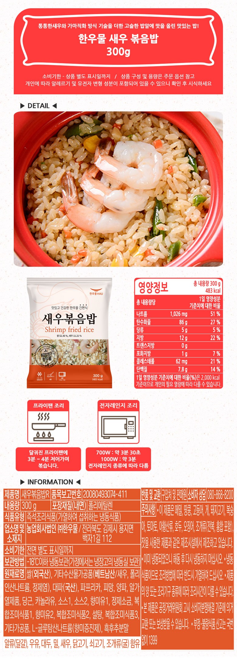 | 제품명 | 한우물 새우 볶음밥 | 식품의 유형 | 즉석조리식품(가열하여 섭취하는 냉동식품) |