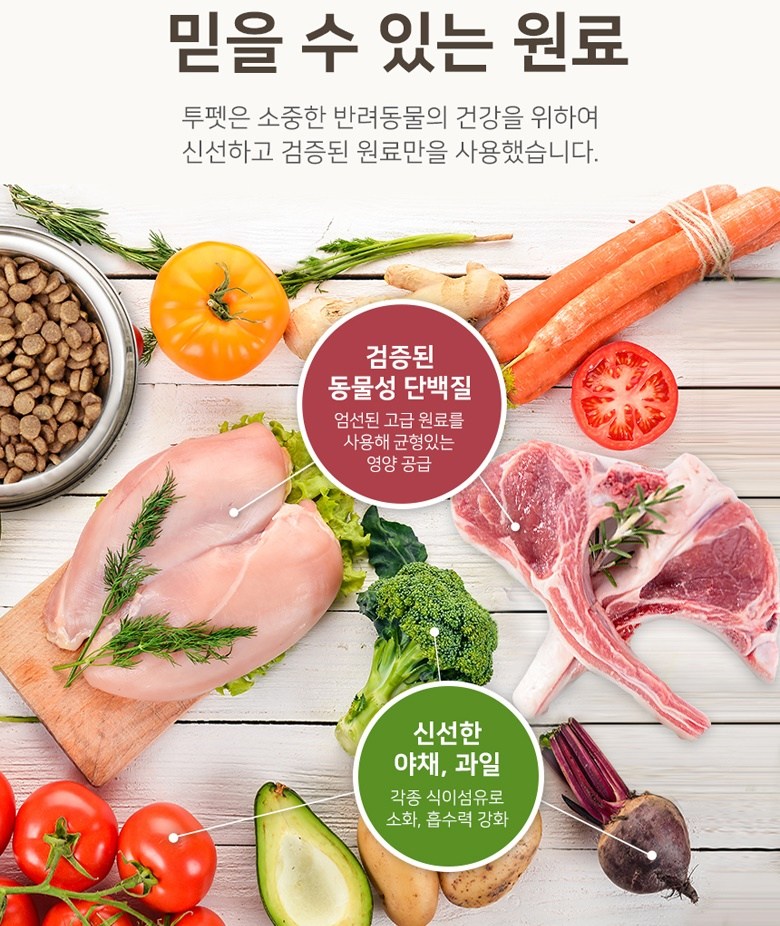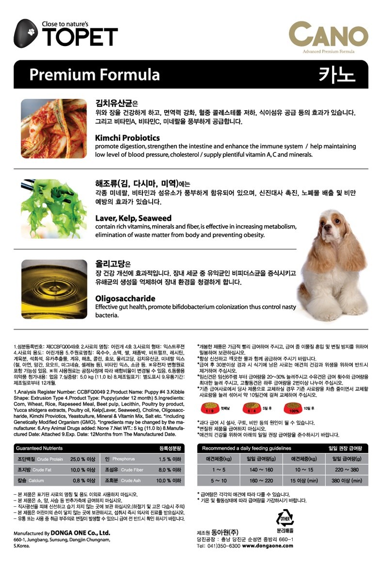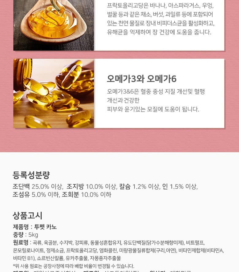 | 품명 및 모델명 | 투펫 카노 전연령 치킨&올리고당 | 인증/허가 사항 | 사료관리법에 따른 성분등록번호 : 컨텐츠 참조 |