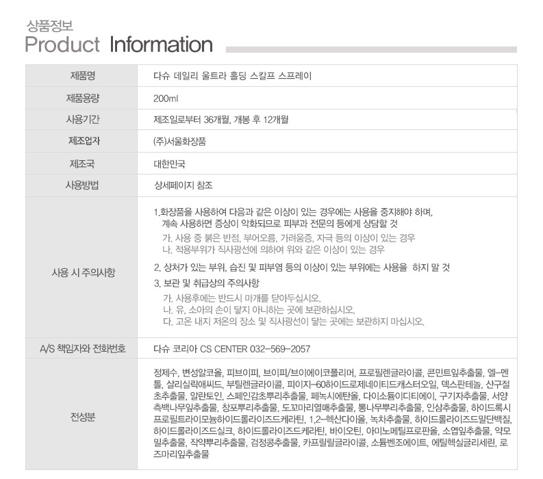 | 화장품제조업자, 화장품책임판매업자 및 맞춤형화장품판매업자 | (주)서울화장품 / 다슈코리아(주) | 제조국 | 한국 |