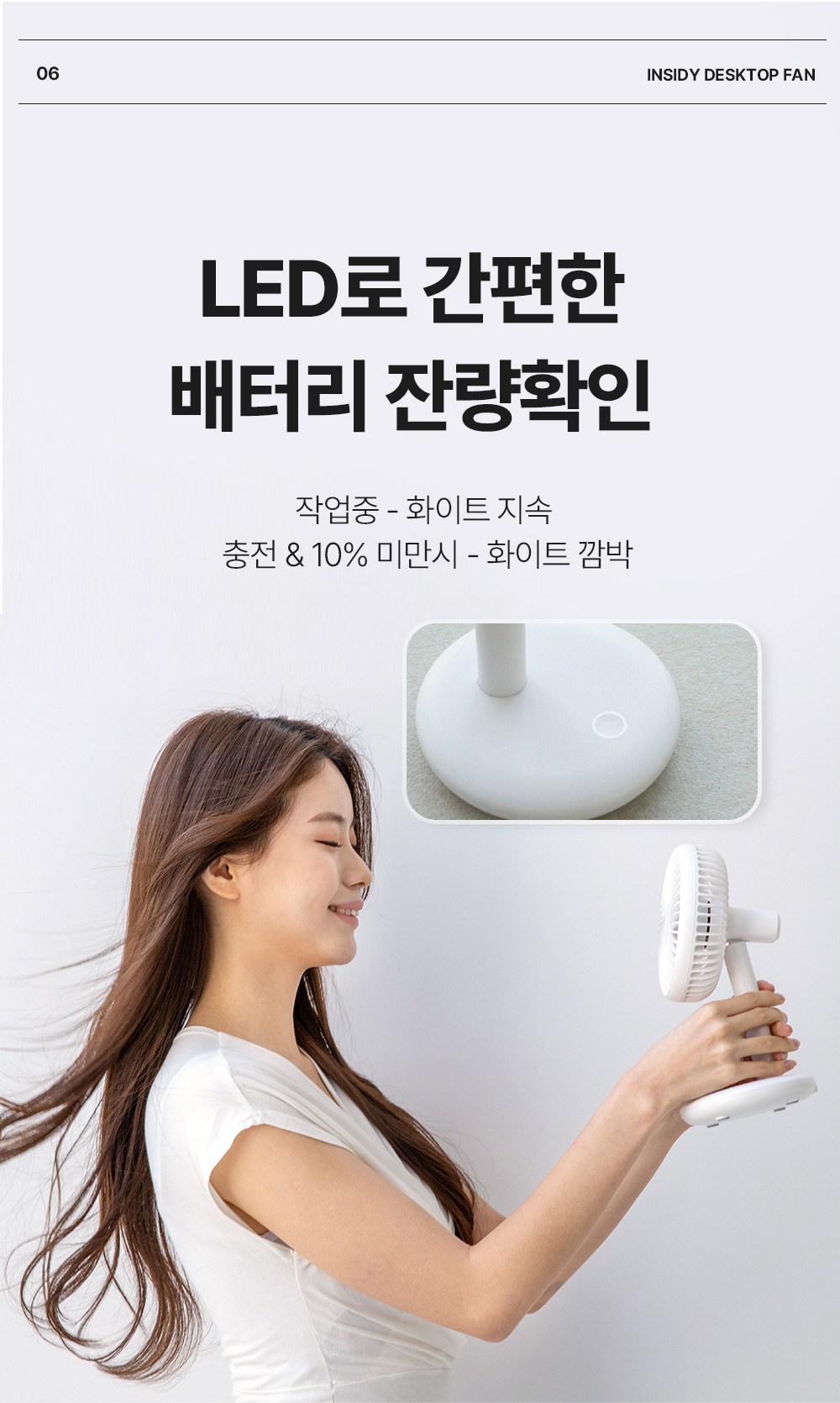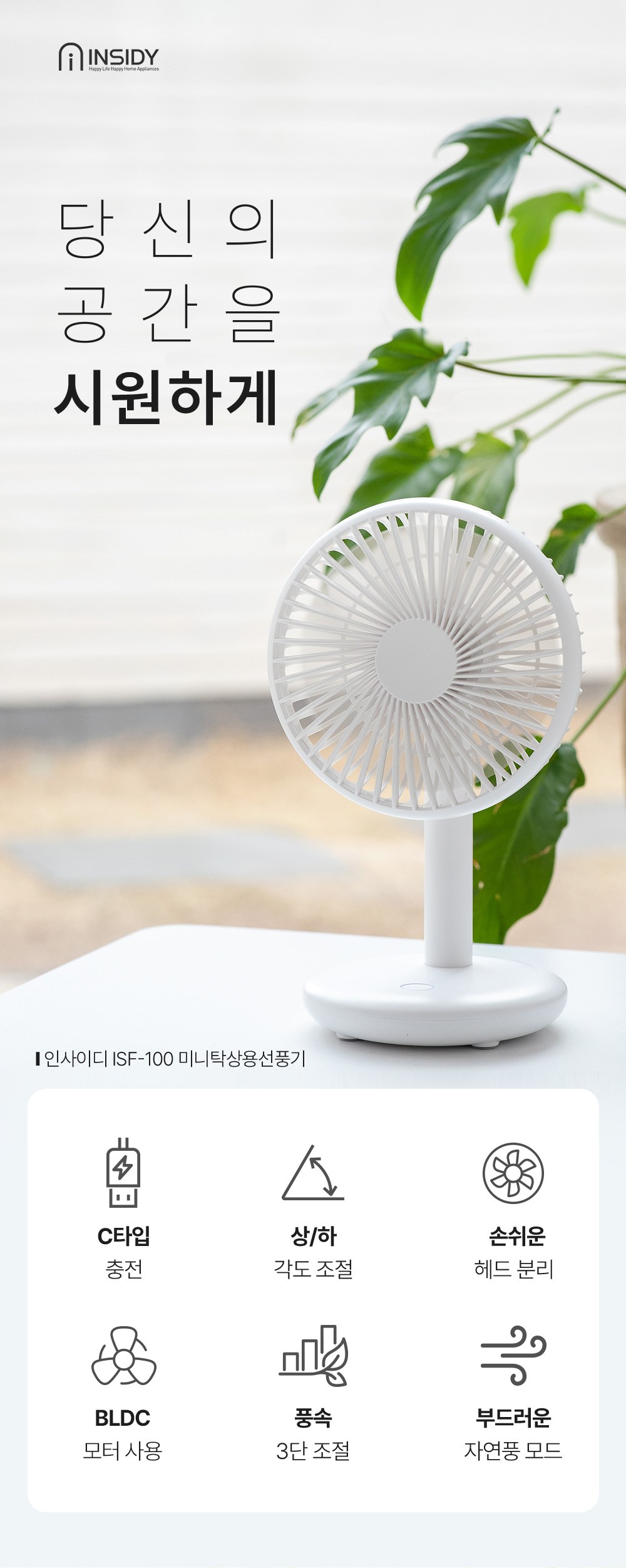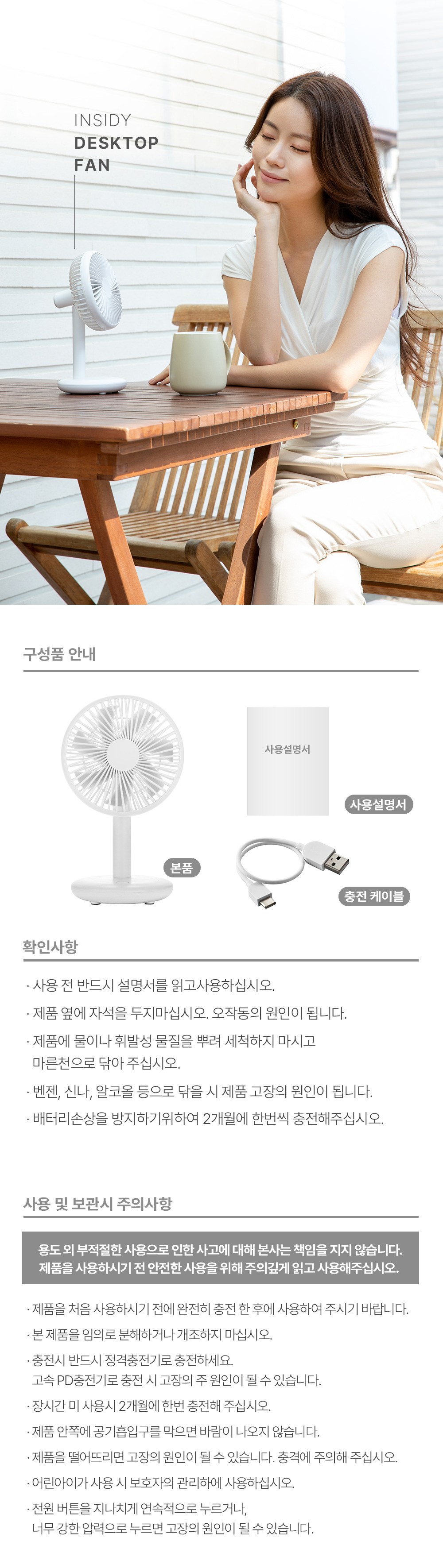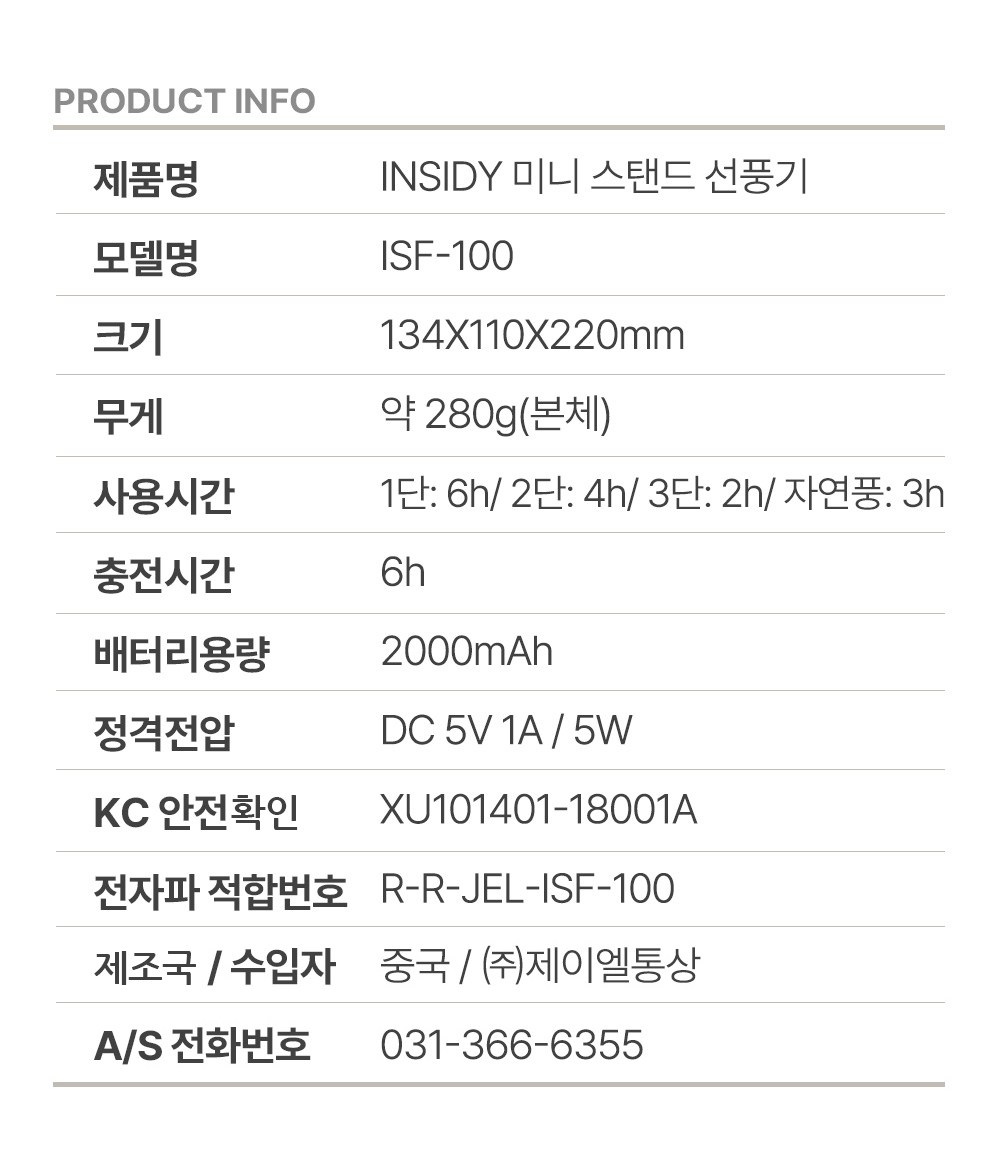 | 품명 및 모델명 | 인사이디 탁상용 BLDC 자연풍 미니 선풍기 무선 저소음 소형 스탠드 선풍기 / ISF-100 | KC 인증정보 | 본품 : R-R-JEL-ISF-100, 전지 : XU101401-18001A |
