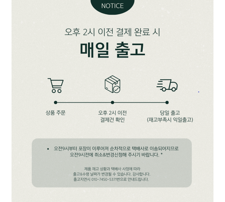 | 교환/반품 비용 (왕복비용) | 10,000원 - 단, 고객 변심의 경우에만 발생 - 도서산간 지역 배송불가 |