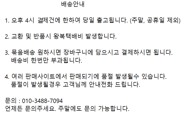 - ㆍ모니터 해상도의 차이로 인해 색상이나 이미지가 실제와 달라, 고객이 단순 변심으로 교환/반품을 무료로 요청하는 경우