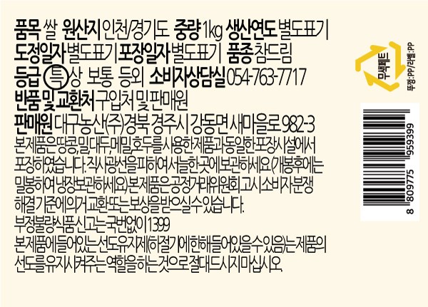 | 제조연월일, 소비기한 또는 품질유지기한 | 제조년월일 : 2025년 12월 12일 이후인 제조상품<br />생산일자 : 2025 | 세부 품목군별 표시사항 | 농수산물 : -유전자변형 : 해당없음 - 지리적 표시사항 : 해당없음 |