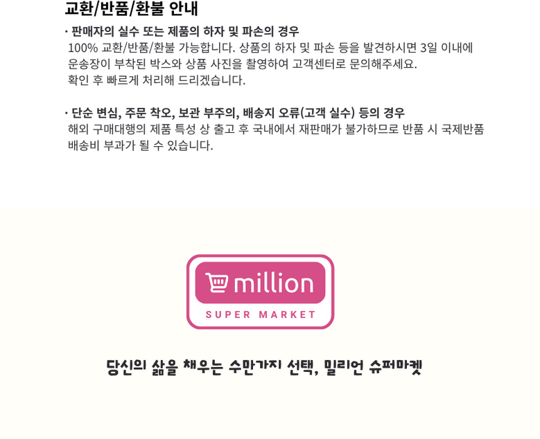 - ㆍ모니터 해상도의 차이로 인해 색상이나 이미지가 실제와 달라, 고객이 단순 변심으로 교환/반품을 무료로 요청하는 경우