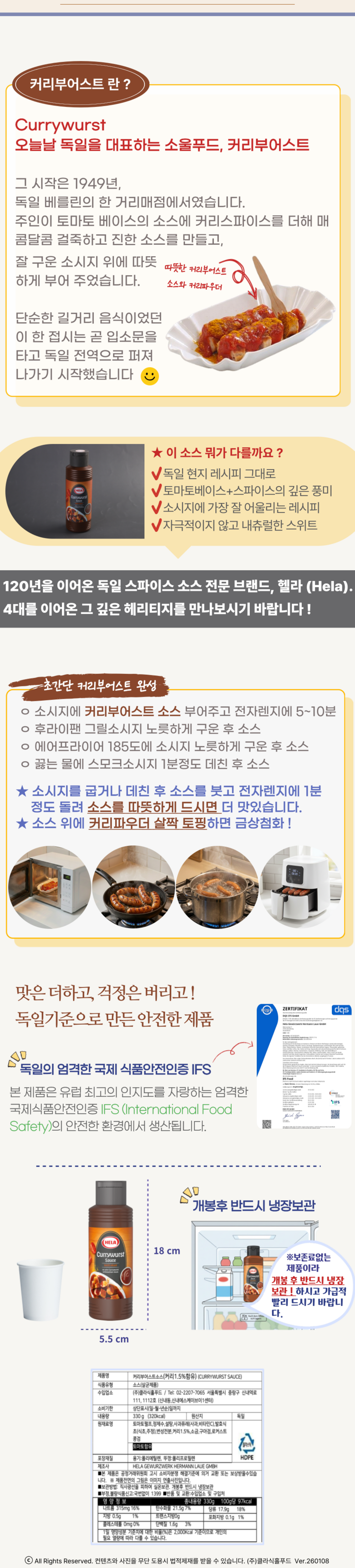| 생산자 및 소재지 | HELA GEWURZWERK HERMANN LAUE GMBH / (주)클라식홀푸드 / 독일 | 제조연월일, 소비기한 또는 품질유지기한 | 2026년 06월 30일 |