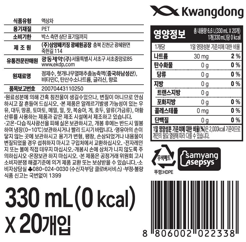 | 포장단위별 내용물의 용량(중량), 수량 | 330ml*20개, 1개 | 원재료명 및 함량 | 컨텐츠 참조 |