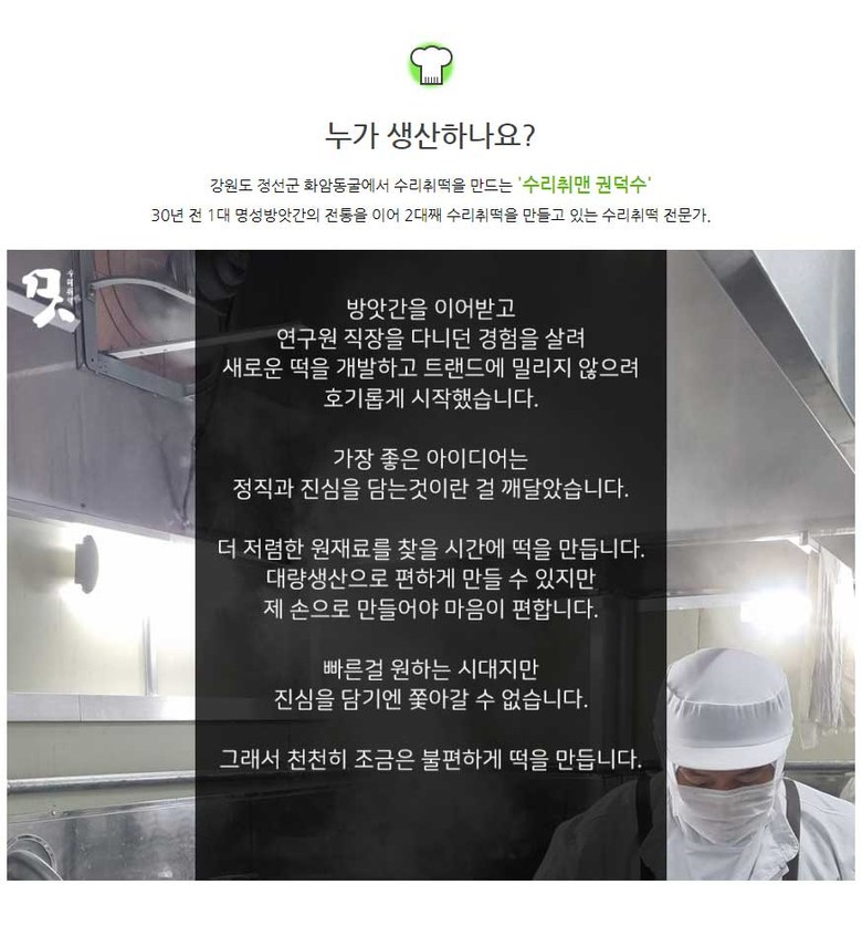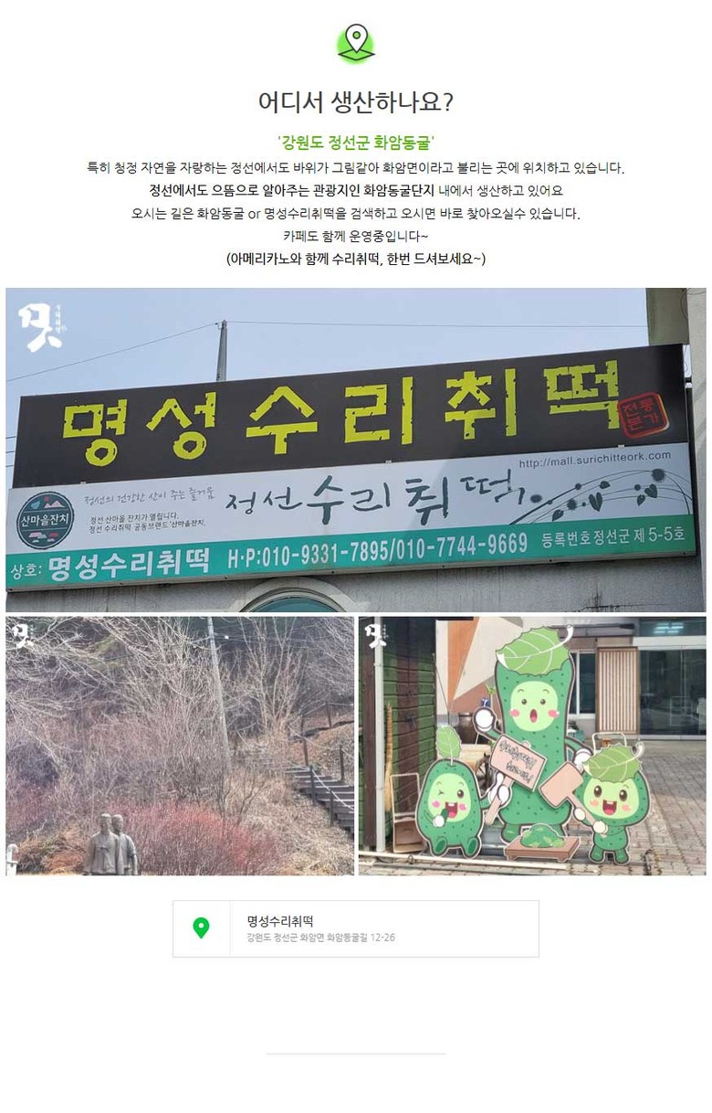 상호/대표자 | 명성수리취떡 / 고세라 | 사업장 소재지 | 강원도 정선군 화암면 화암동굴길 12-26 명성수리취떡 |