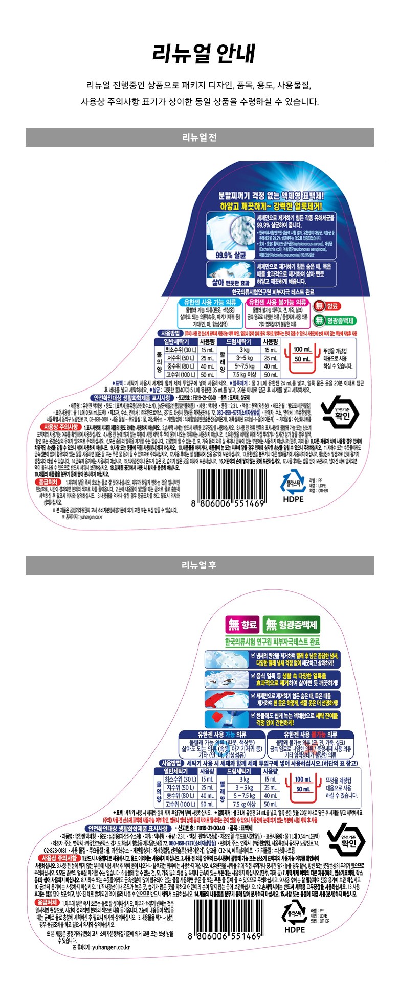 | 품목 및 제품명 | 리뉴얼 전: 표백제, 살균제 l 리뉴얼 후: 표백제/ 유한젠 액체형 | 용도(표백제의 경우 계열을 함께표시) 및 제형 | 리뉴얼 전: 일반용-일반물체용,섬유용-과산화수소계 l 리뉴얼 후: 섬유용 (과산화수소계)/ 액체형 |