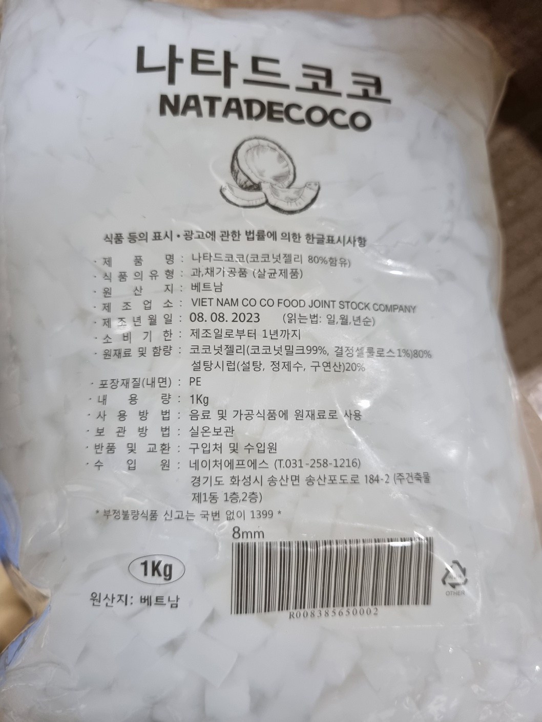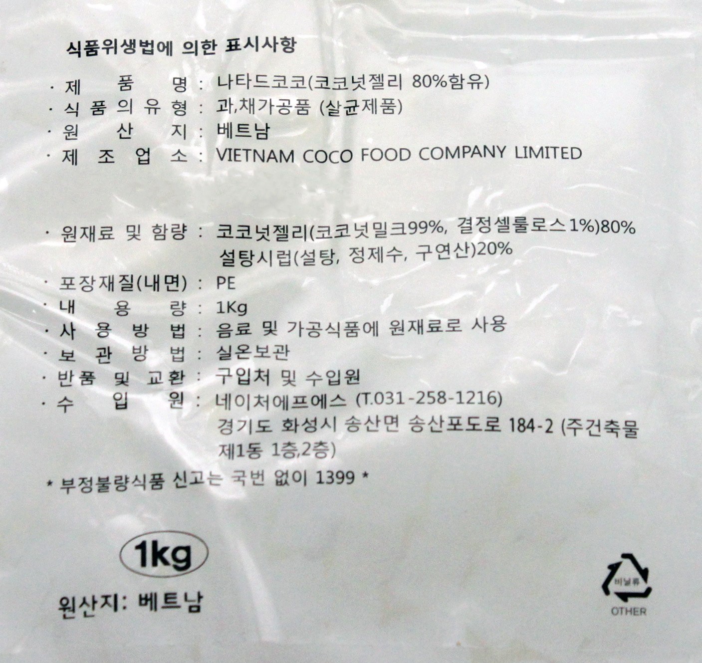 | 제품명 | 나타드코코(코코넛젤리 80%함유) | 식품의 유형 | 과,채가공품 (살균제품) |