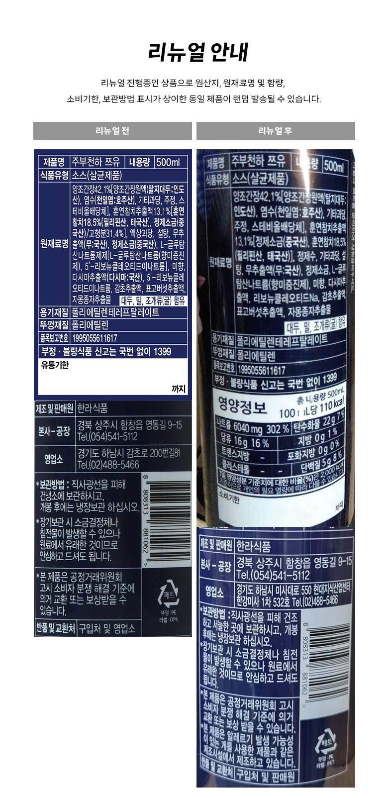 | 포장단위별 내용물의 용량(중량), 수량 | 500ml x 2개,1개 | 원재료명 및 함량 | 컨텐츠 참조 |