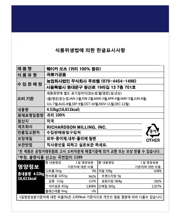 - 곡물 구분: 귀리/오트