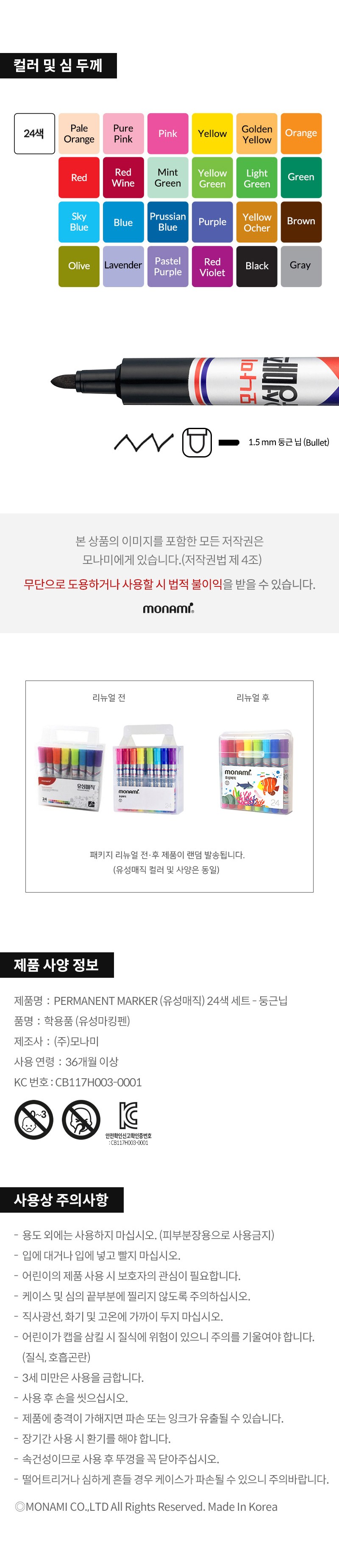 | 품명 및 모델명 | PERMANENT MAKER 유성매직 24색 세트-둥근닙 | KC 인증정보 | CB117H003-0001 |