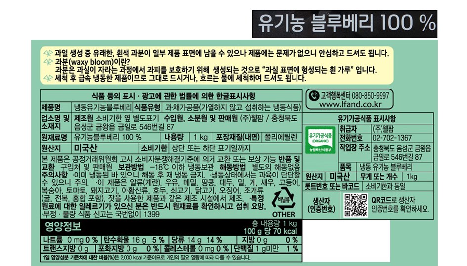 꼭지의 흰색(혹은 푸른색) 부분은 블루베리의 과분, 성에입니다. 과분은 과피를 보호하기 위해 생기는 자연스러운 물질이며, 과분과 성에는 품질의 이상이 아니므로 안심하고 드셔도 됩니다.