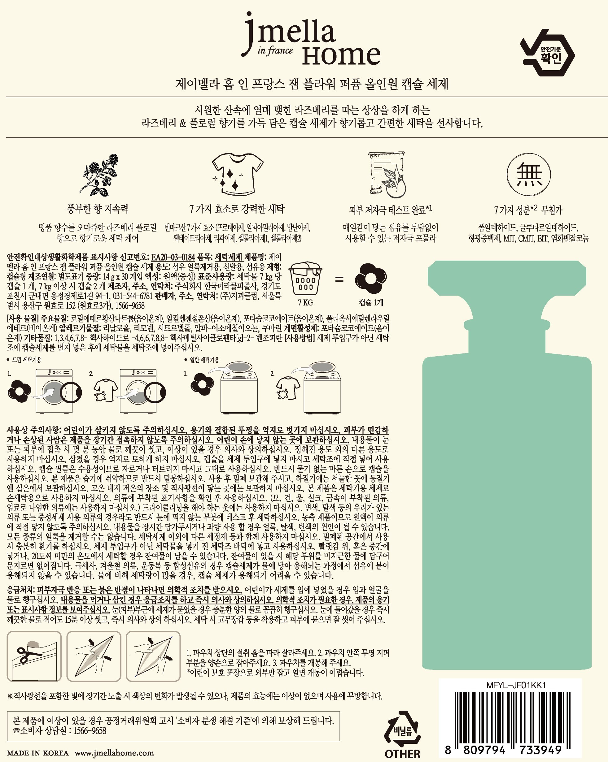 | 품목 및 제품명 | 세탁세제 / 제이멜라 홈 인 프랑스 잼 플라워 퍼퓸 올인원 캡슐 세제 | 용도(표백제의 경우 계열을 함께표시) 및 제형 | 섬유 얼룩제거용,신발용,섬유용 / 캡슐형 |