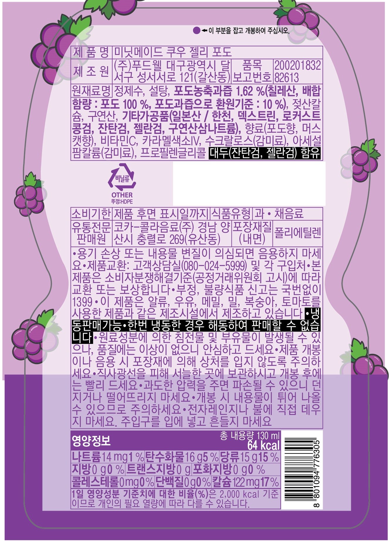 | 포장단위별 내용물의 용량(중량), 수량 | 130mlx30개입 | 원재료명 및 함량 | 컨텐츠 참조 |
