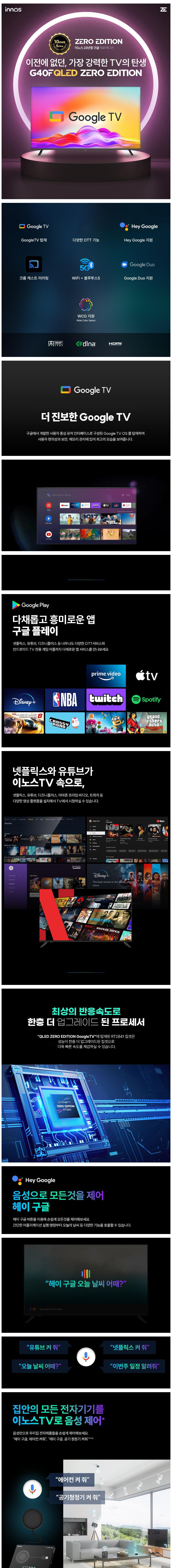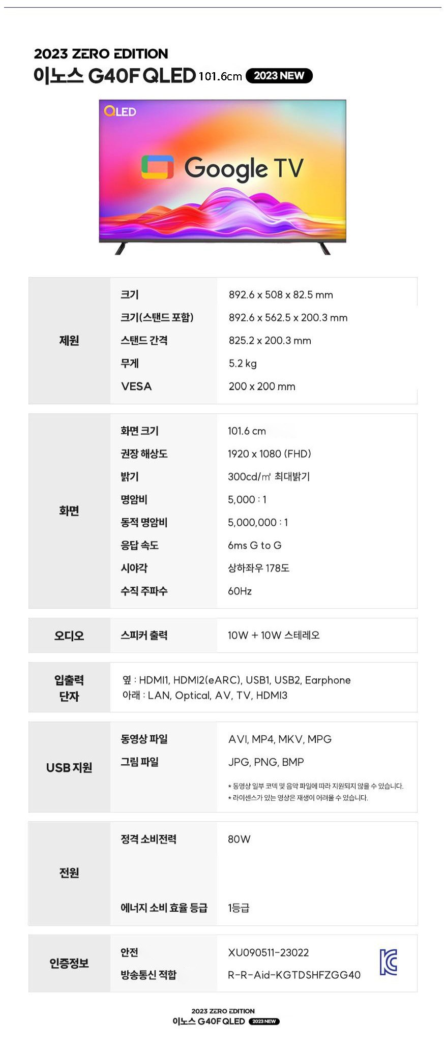 | 품명 및 모델명 | 이노스 FHD QLED 구글 OS 스마트 TV/ NEW G40F QLED ZERO EDITION | KC 인증정보 | XU090511-23022A, R-R-Aid-KGTDSHFZGG40 |