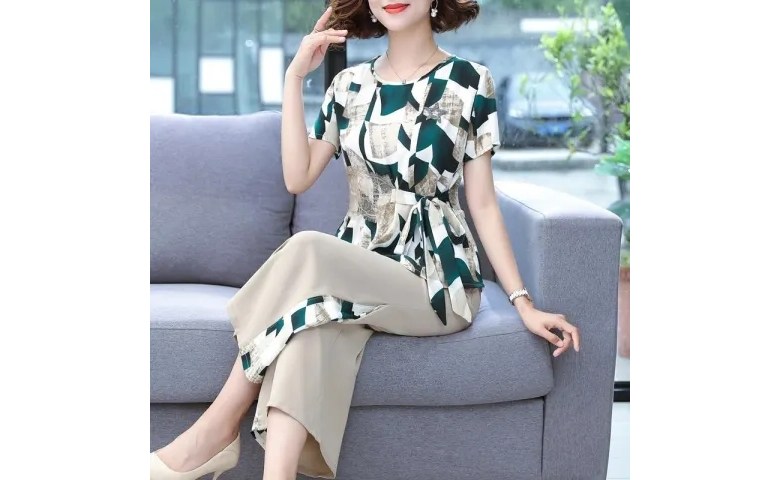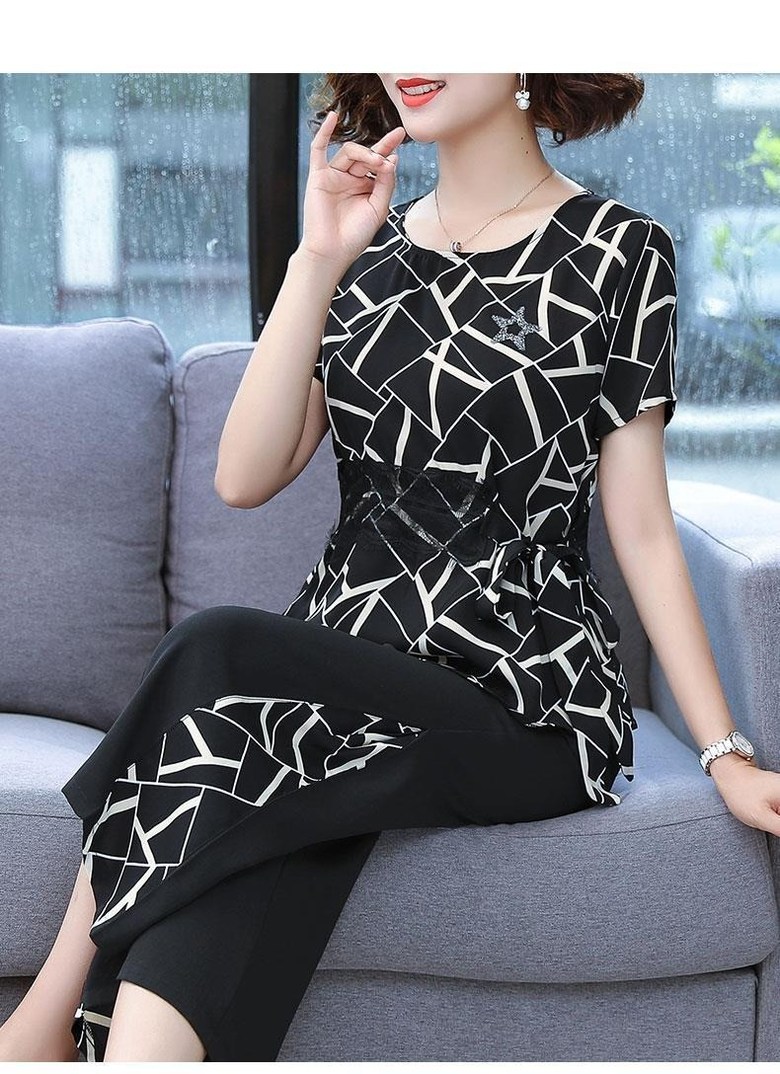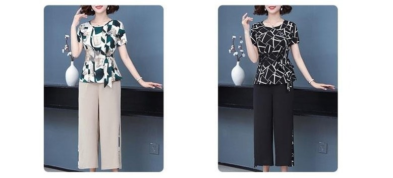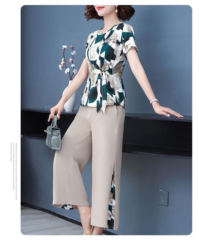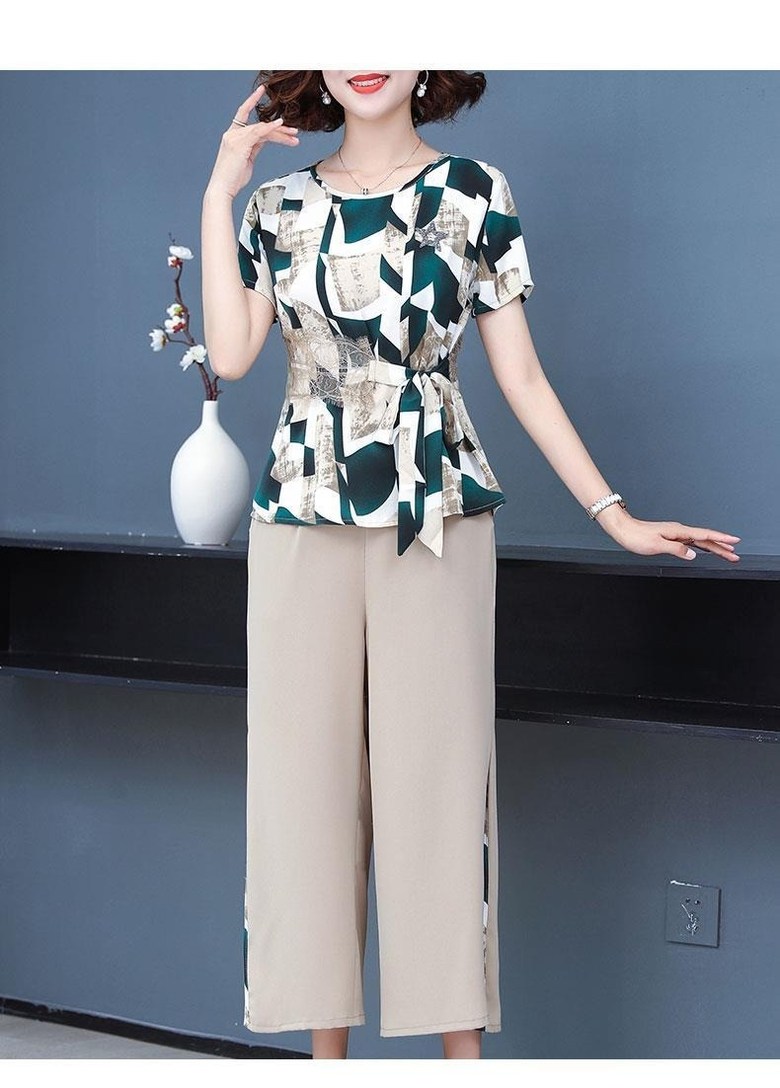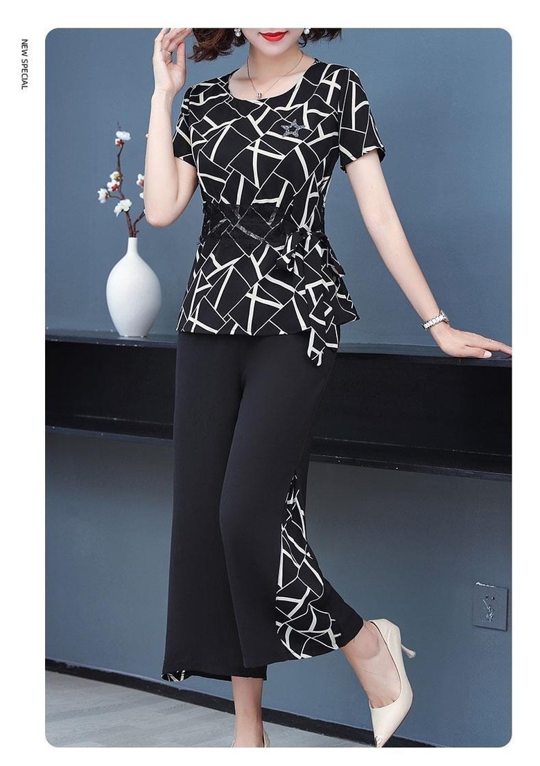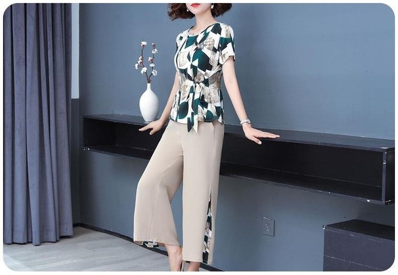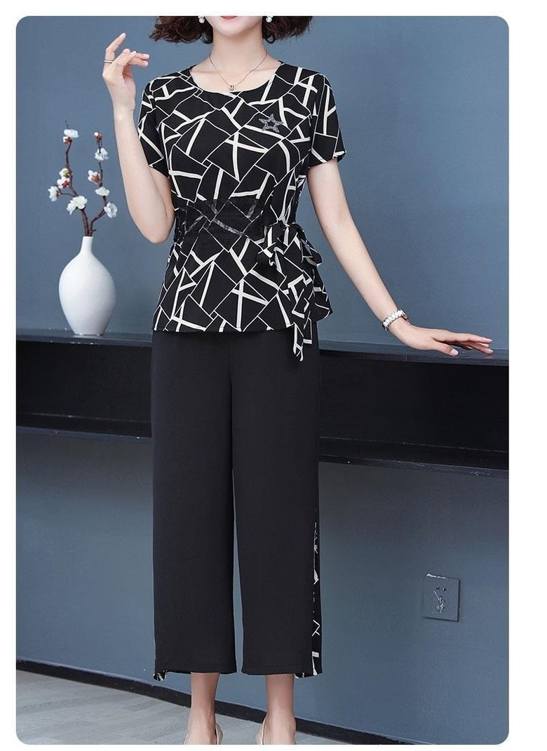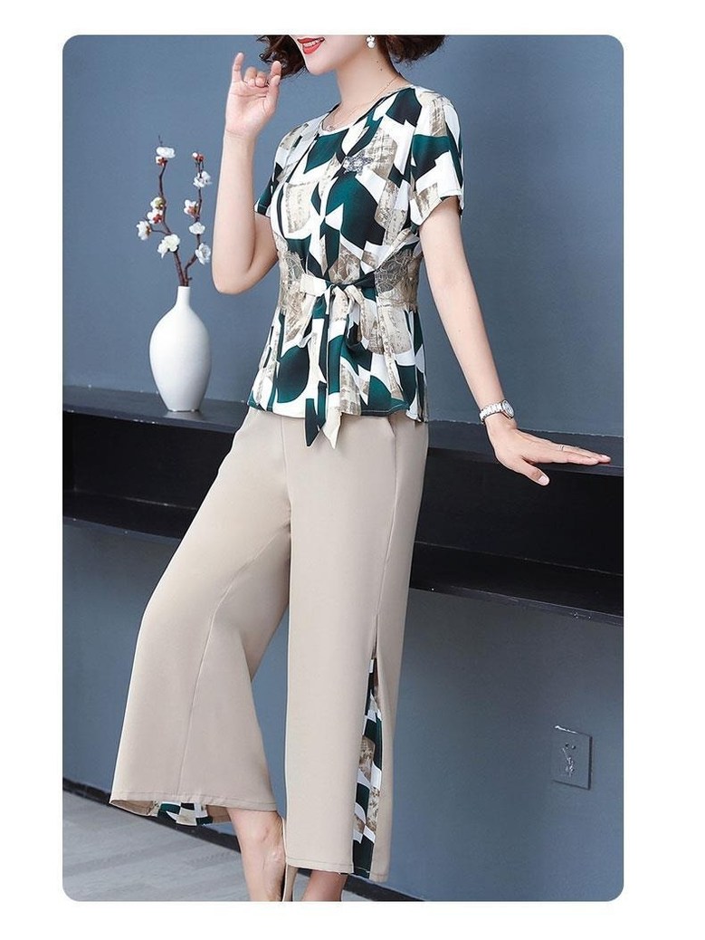 미미앤느 여름 중년 와이드 레그 팬츠 그래픽 탑 세트