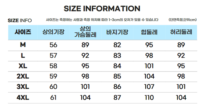- 하의 사이즈: 여성 XL 이상