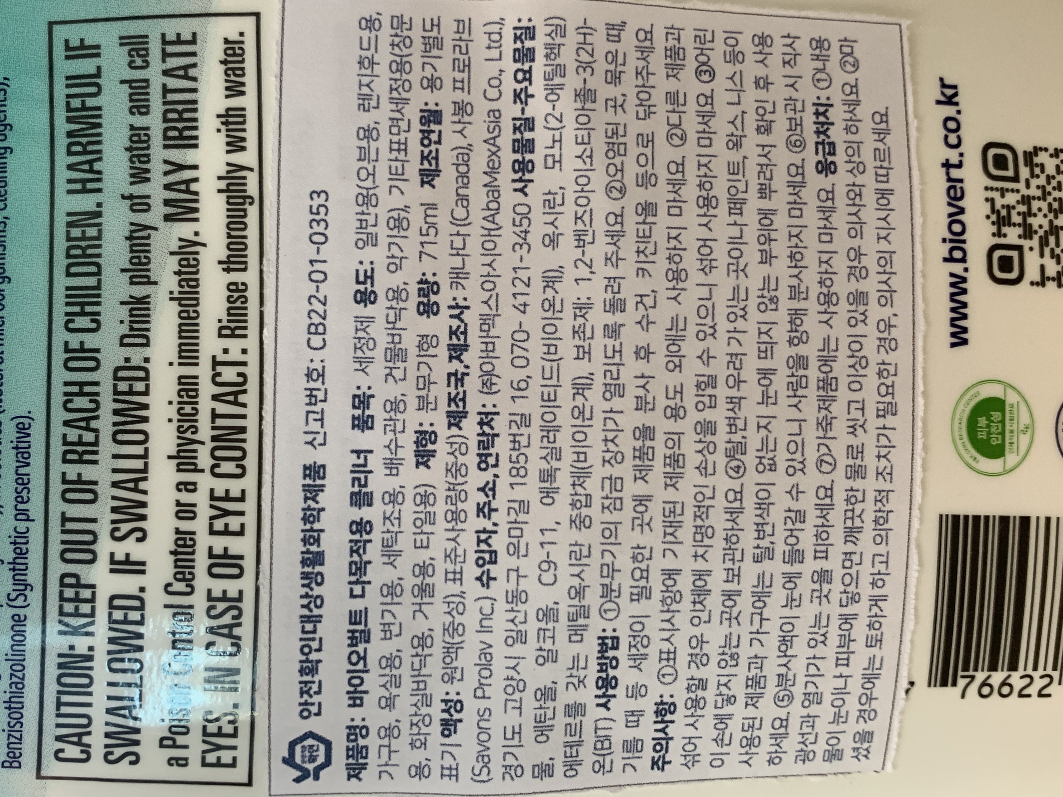 | 품목 및 제품명 | 세정제/바이오벌트 다목적 클리너 | 용도(표백제의 경우 계열을 함께표시) 및 제형 | 일반용-오븐용,일반용-렌지후드용,일반용-욕실용,일반용-변기용,일반용-세탁조용,일반용-배수관용,일반용-건물 바닥용,일반용-가구용,일반용-악기용,일반용-기타표면세정용-창문용, 화장실바닥용, 거울용, 타일용/분사형-분무기형 |
